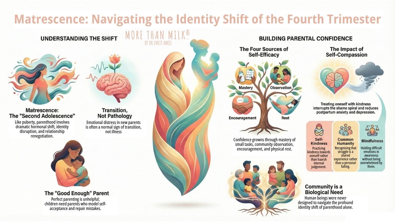 The second is vicarious experience: watching others navigate the same task successfully. This is one of the clearest arguments for community in the fourth trimester. When new parents are isolated from other new parents, they miss one of the primary mechanisms through which confidence is built. Seeing another parent struggle with the same things, and manage... it is not just reassuring. It is genuinely instructive.